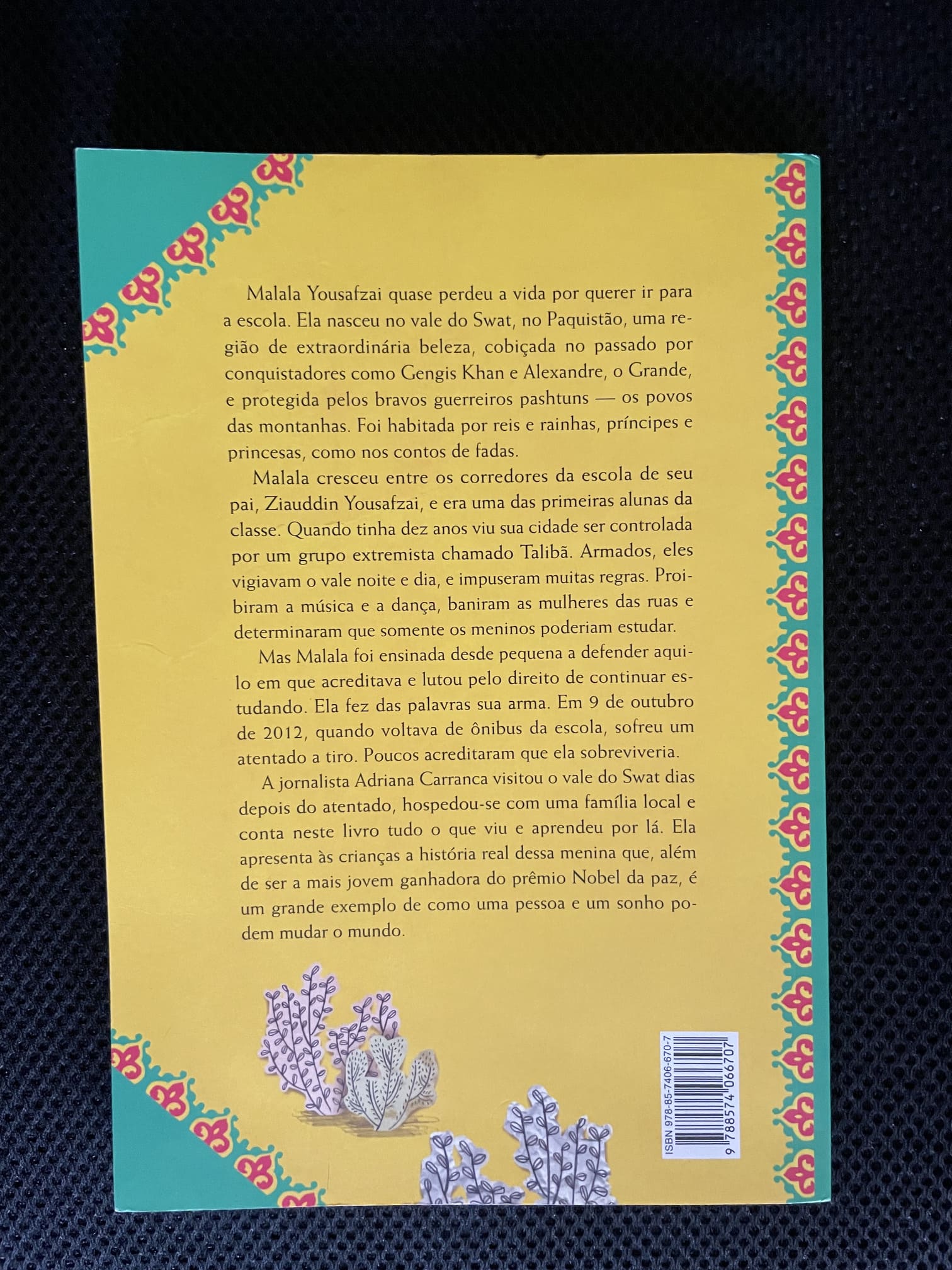 Malala Yousafzai quase perdeu a vida por querer ir para a escola. Ela nasceu no vale do Swat, no Paquistão, uma região de extraordinária beleza, cobiçada no passado por conquistadores como Gengis Khan e Alexandre, o Grande, e protegida pelos bravos guerreiros pashtuns – os povos das montanhas. Foi habitada por reis e rainhas, príncipes e princesas, como nos contos de fadas. Malala cresceu entre os corredores da escola de seu pai, Ziauddin Yousafzai, e era uma das primeiras alunas da classe. Quando tinha dez anos viu sua cidade ser controlada por um grupo extremista chamado Talibã. Armados, eles vigiavam o vale noite e dia, e impuseram muitas regras. Proibiram a música e a dança, baniram as mulheres das ruas e determinaram que somente os meninos poderiam estudar. Mas Malala foi ensinada desde pequena a defender aquilo em que acreditava e lutou pelo direito de continuar estudando. Ela fez das palavras sua arma. Em 9 de outubro de 2012, quando voltava de ônibus da escola, sofreu um atentado a tiro. Poucos acreditaram que ela sobreviveria. A jornalista Adriana Carranca visitou o vale do Swat dias depois do atentado, hospedou-se com uma família local e conta neste livro tudo o que viu e aprendeu por lá. Ela apresenta às crianças a história real dessa menina que, além de ser a mais jovem ganhadora do prêmio Nobel da paz, é um grande exemplo de como uma pessoa e um sonho podem mudar o mundo.
